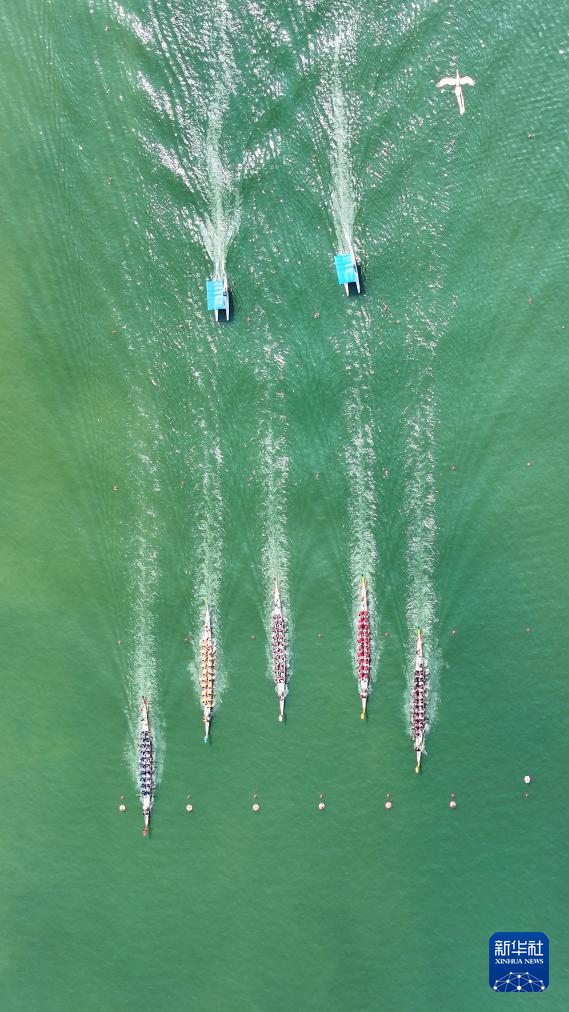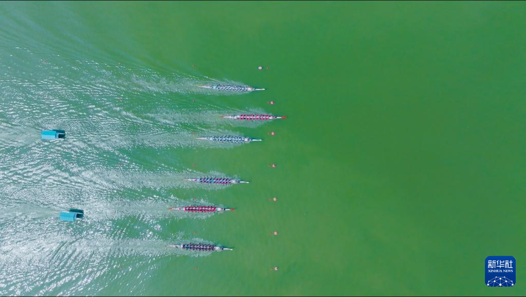 5月25日,参赛队伍在“庐山杯”长江经济带龙舟邀请赛中竞技(无人机照片)。新华社发(胡铭摄)