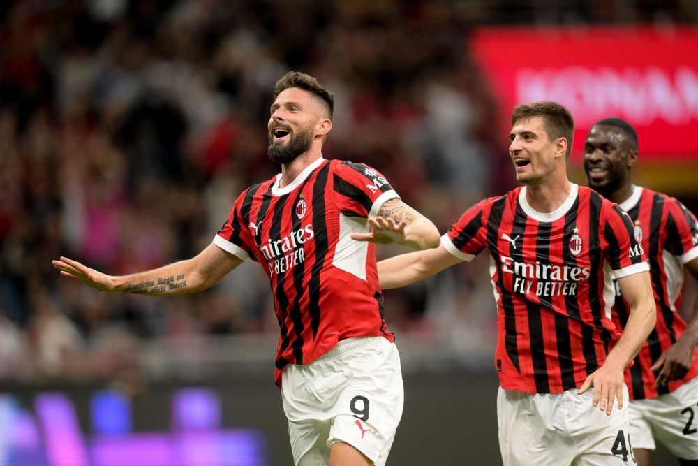 5月25日,AC米兰队球员吉鲁(左)庆祝进球。新华社发(奥古斯托·卡萨索利摄)