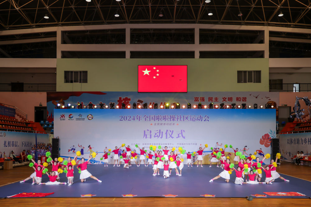新华社长沙5月26日电 为继续推动大体操助力乡村振兴建设,2024年全国啦啦操社区运动会26日在湖南省张家界市桑植县贺龙体育馆开幕。