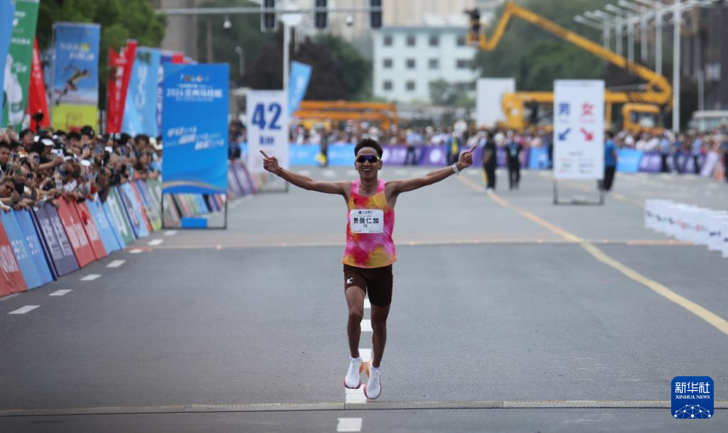 5月26日,中国选手贾俄仁加抵达终点。最终,他以2小时14分33秒的成绩获得男子马拉松中国籍参赛选手第一名。新华社记者 张智敏 摄
