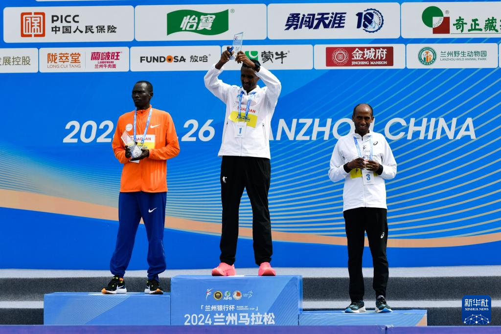 5月26日,男子马拉松冠军埃塞俄比亚选手阿费沃尔克·梅斯芬(中)、亚军肯尼亚选手乔尔·肯博伊·基穆勒(左)、季军埃塞俄比亚选手安杜阿勒姆·贝莱在颁奖仪式上。新华社记者 郎兵兵 摄