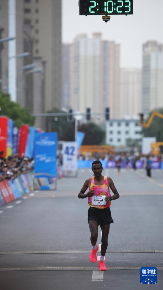 5月26日,埃塞俄比亚选手阿费沃尔克·梅斯芬冲过终点。他以2小时10分23秒的成绩获得男子马拉松冠军。新华社记者 张智敏 摄