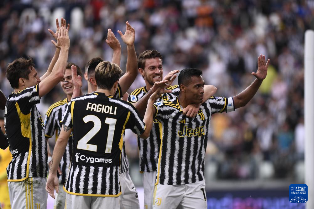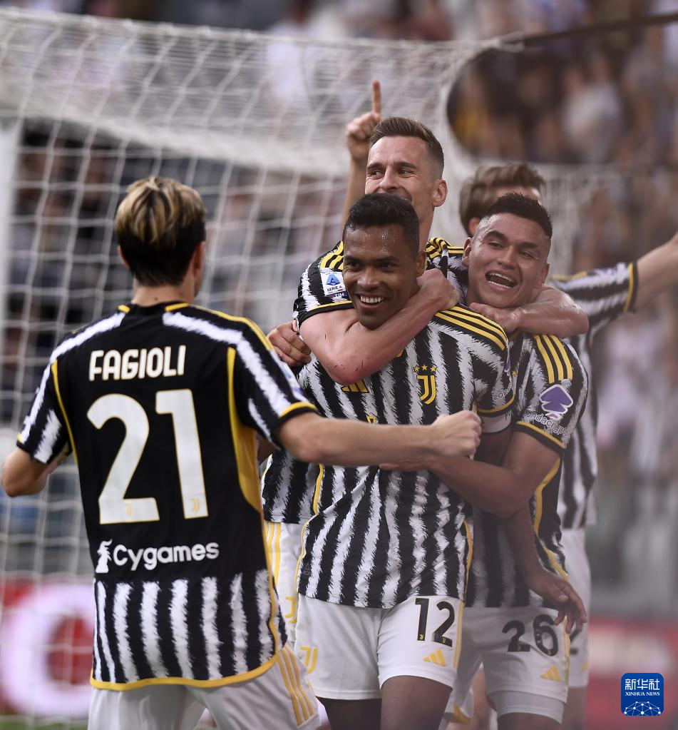 5月25日,尤文图斯队球员阿莱士·桑德罗(右一)与队友庆祝进球。新华社发(费代里科·塔尔迪托摄)