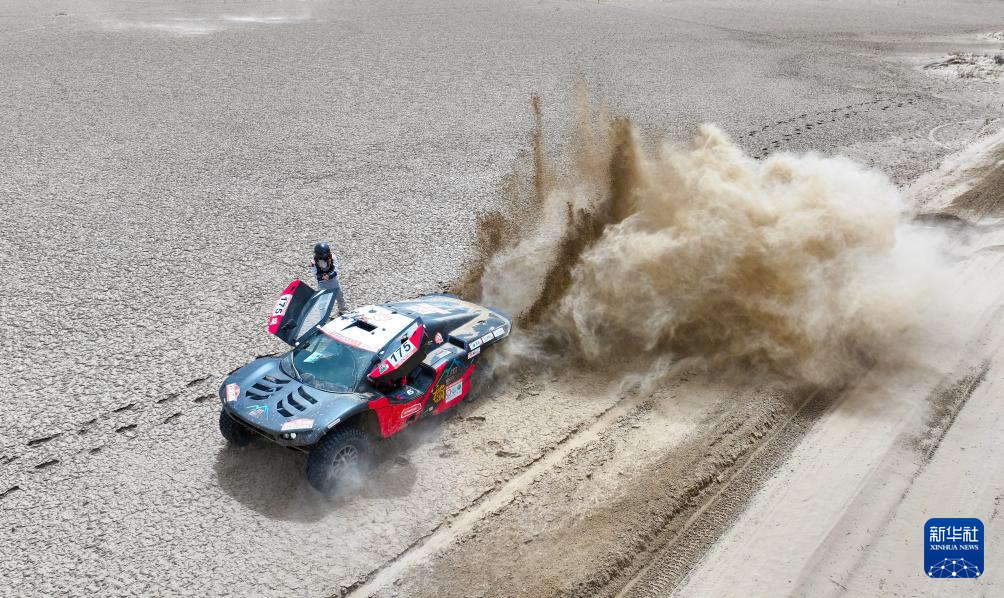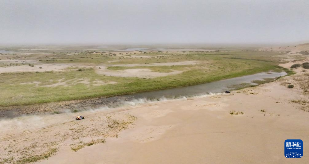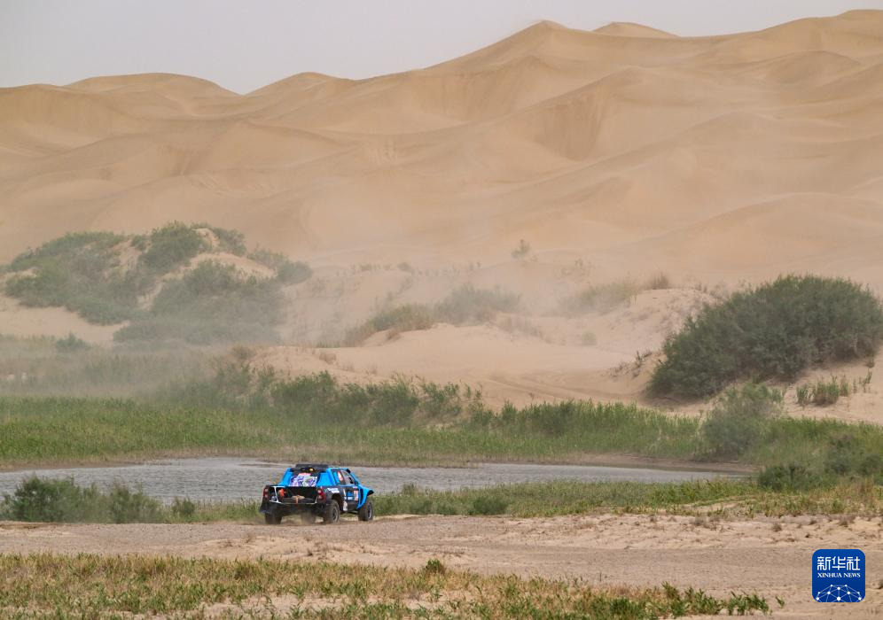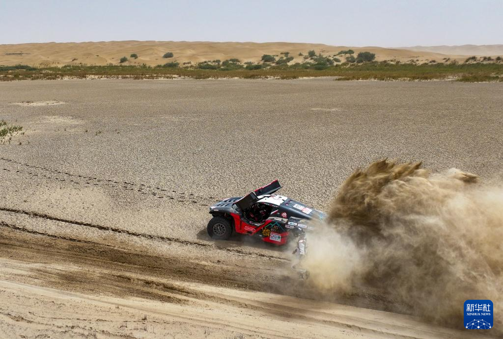 5月26日,CR7赛车队车手张鹏、领航员童振荣在比赛中(无人机照片)。新华社记者 陈朔 摄