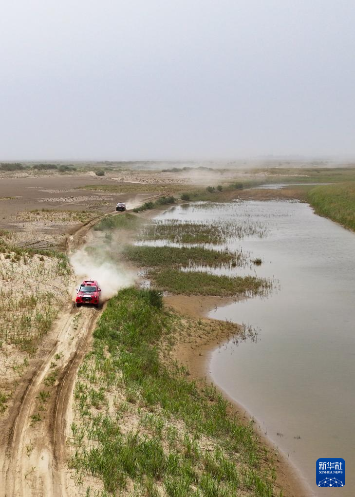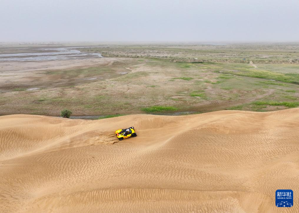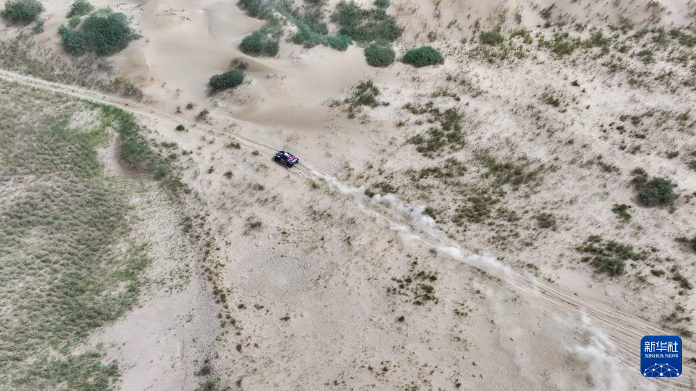 5月26日,韩魏汽车运动车队车手李大治、领航员王先晨在比赛中(无人机照片)。新华社记者 陈朔 摄