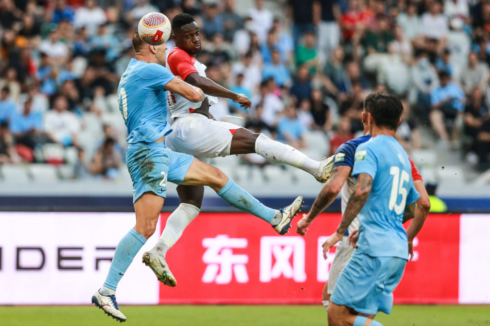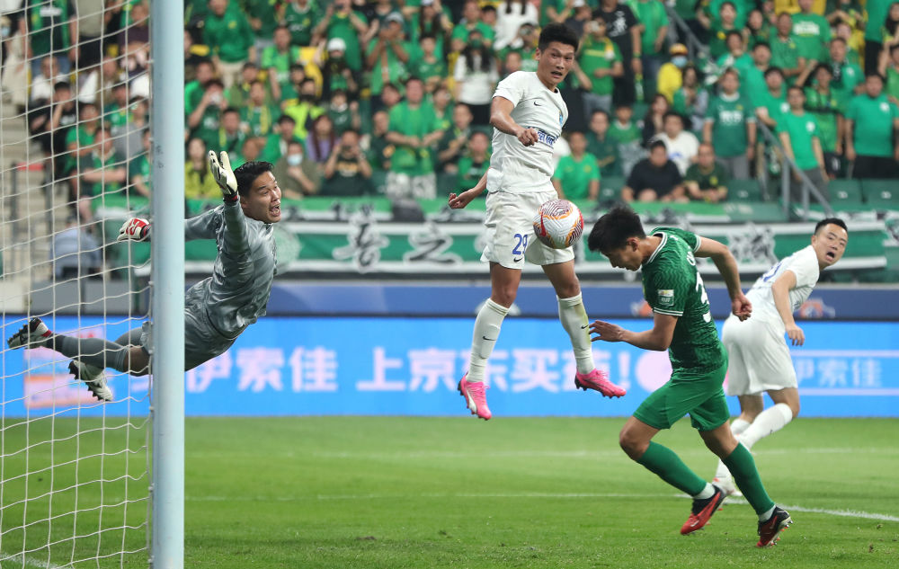 5月26日,北京国安队球员曹永竞(右二)在比赛中头球攻门。新华社记者 贾浩成 摄