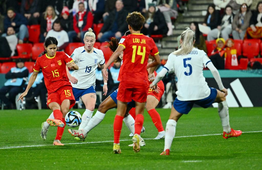 2023年8月1日,中国队球员陈巧珠(左一)在比赛中射门。当日,在澳大利亚阿德莱德举行的2023年国际足联女足世界杯小组赛D组比赛中,中国队以1:6不敌英格兰队,小组排名第三,无缘晋级淘汰赛。新华社记者 李一博 摄