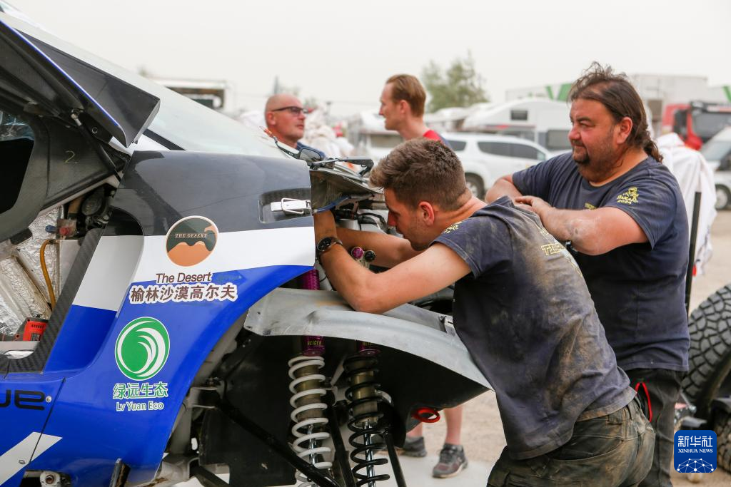 5月27日,陕西云翔俱乐部技师在和田洛浦大营检修车辆。新华社记者 陈朔 摄