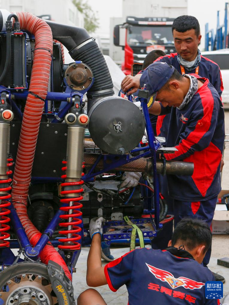 5月27日,陕西云翔汽摩运动有限公司技师在和田洛浦大营检修车辆。新华社记者 陈朔 摄