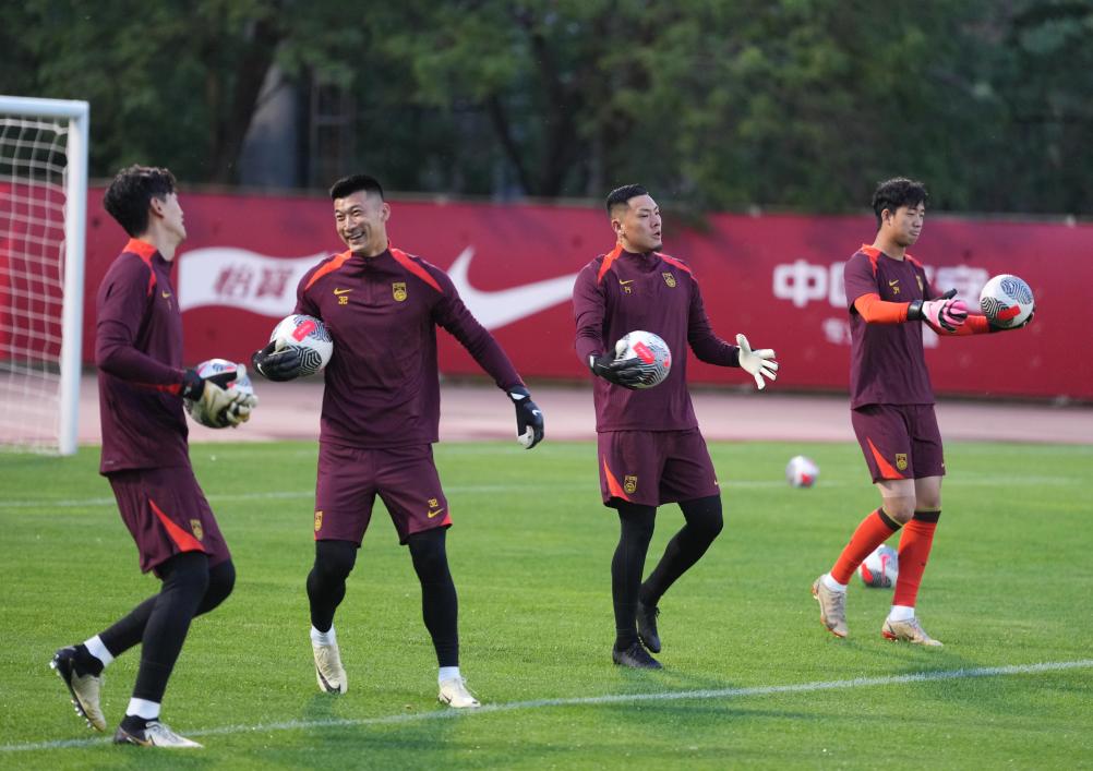 5月27日,中国队门将颜骏凌、刘殿座、王大雷和鲍亚雄(从左至右)在训练中。新华社记者 章磊 摄