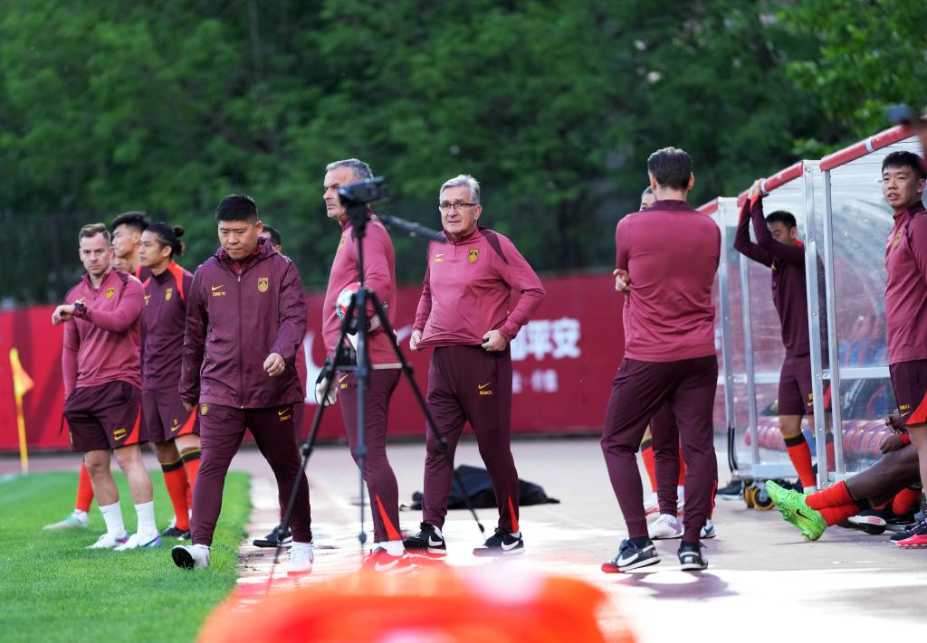 5月27日,中国队主教练伊万科维奇(中)观看队员训练。新华社记者 章磊 摄