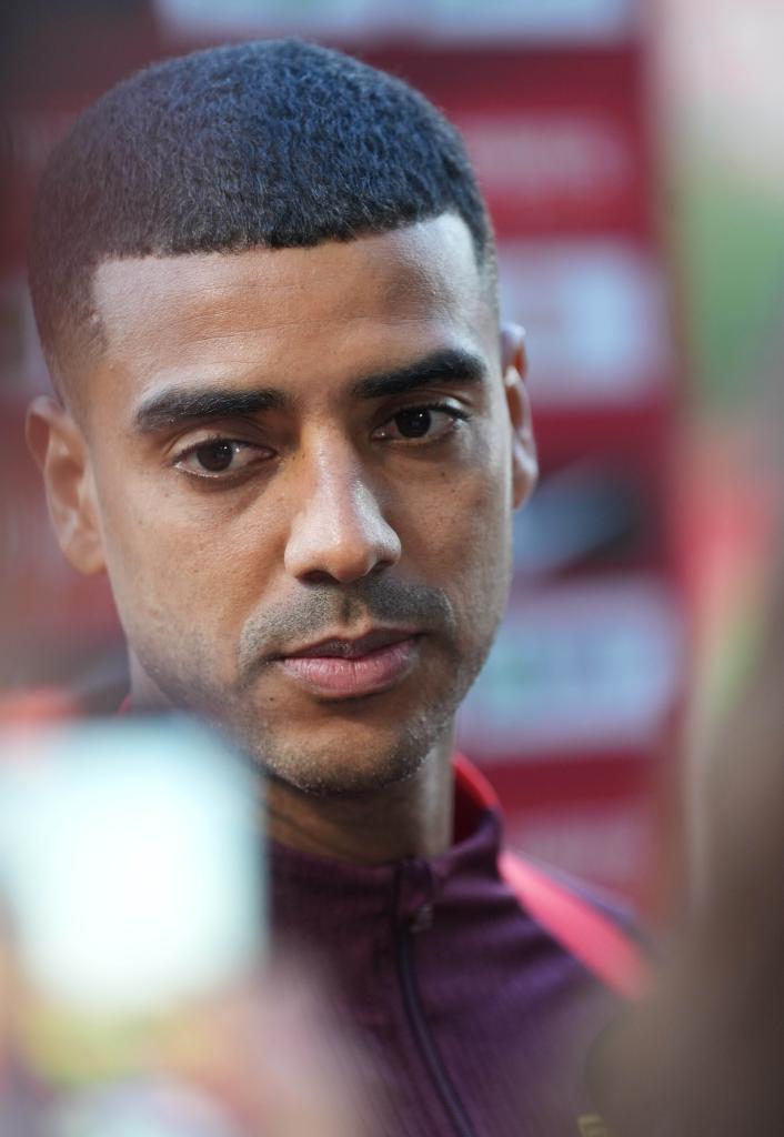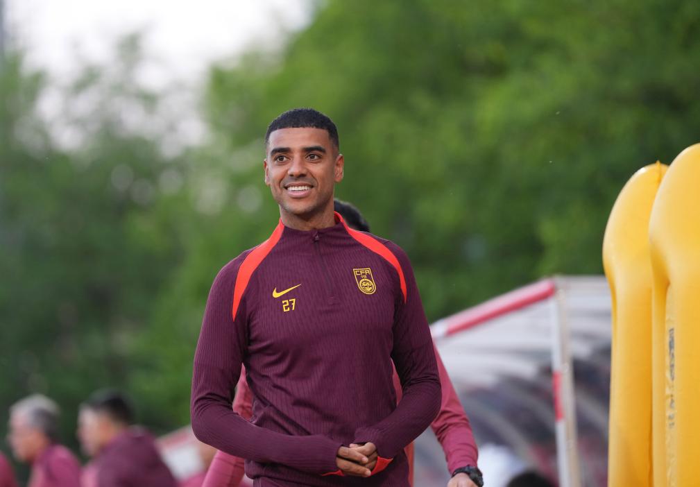 5月27日,中国队球员阿兰在训练间隙准备接受采访。新华社记者 李钢 摄