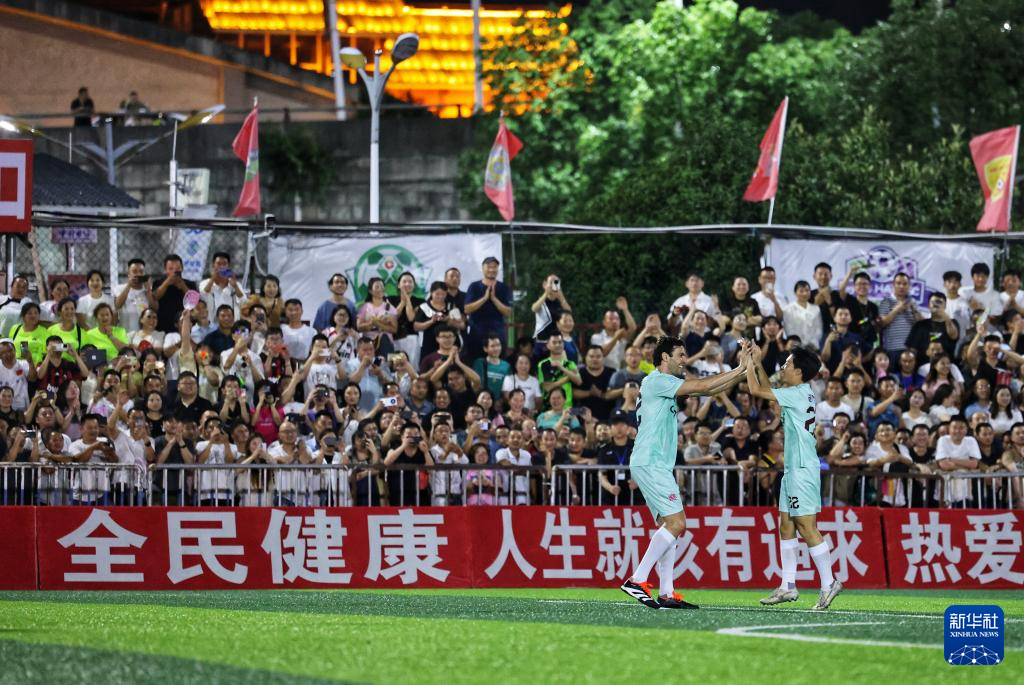 5月27日,卡卡(左)在“逐梦”冠军明星公益赛中和队友庆祝进球。新华社记者 刘续 摄