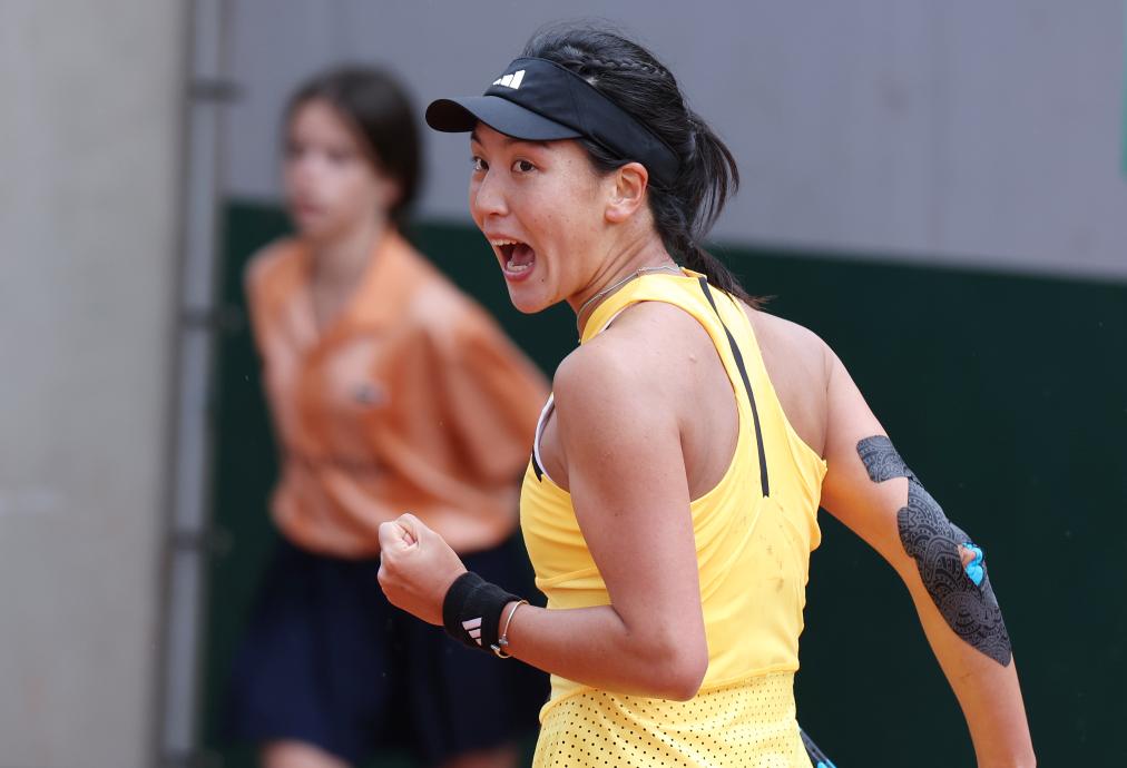 5月30日,郑钦文在比赛中庆祝得分。新华社记者 孟鼎博 摄