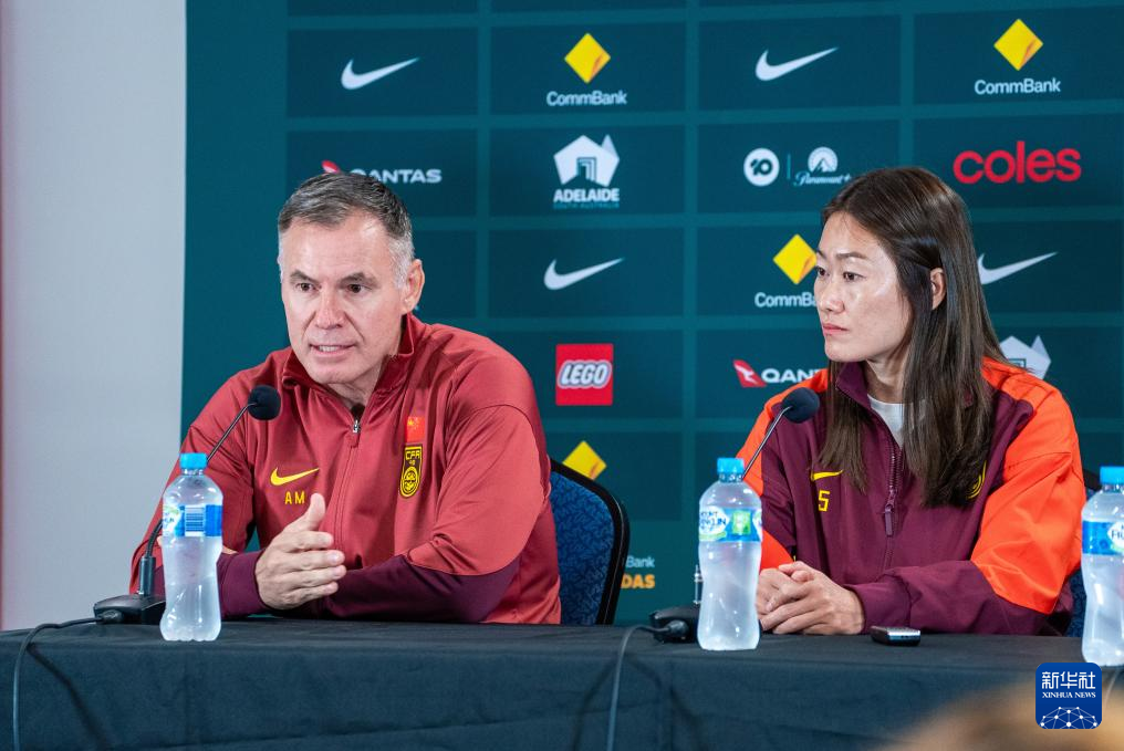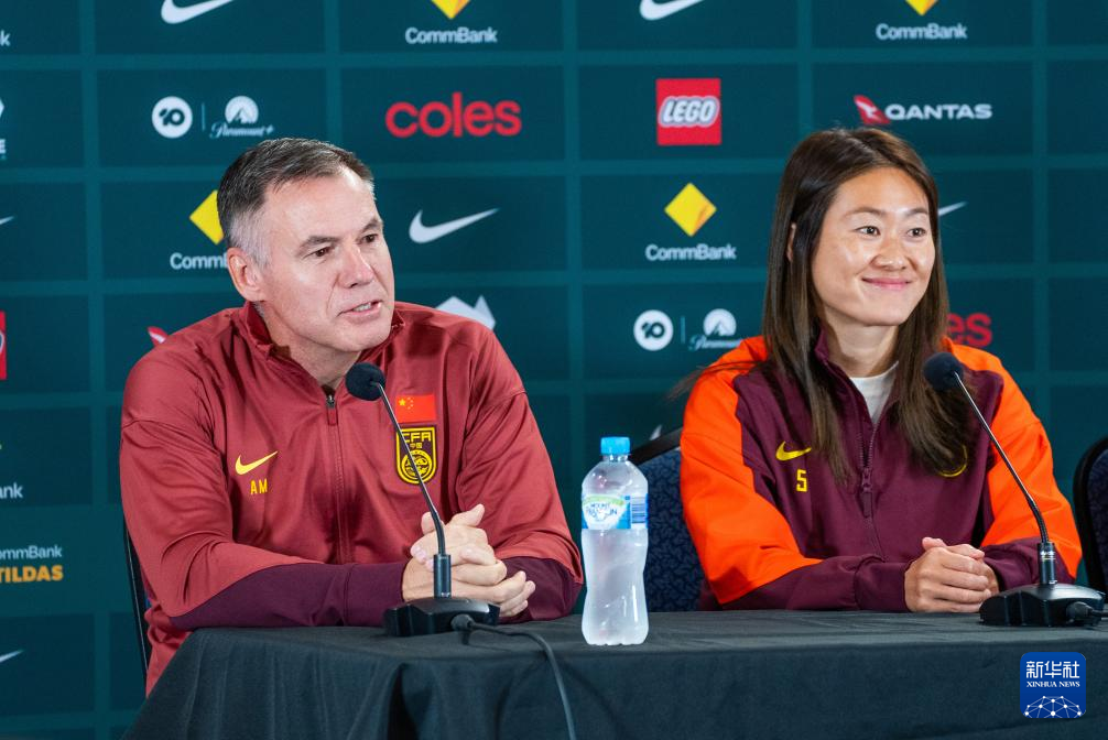 当日,中国国家女子足球队主教练安特·米利西奇与队员吴海燕在澳大利亚阿德莱德出席中澳女足友谊赛赛前新闻发布会。