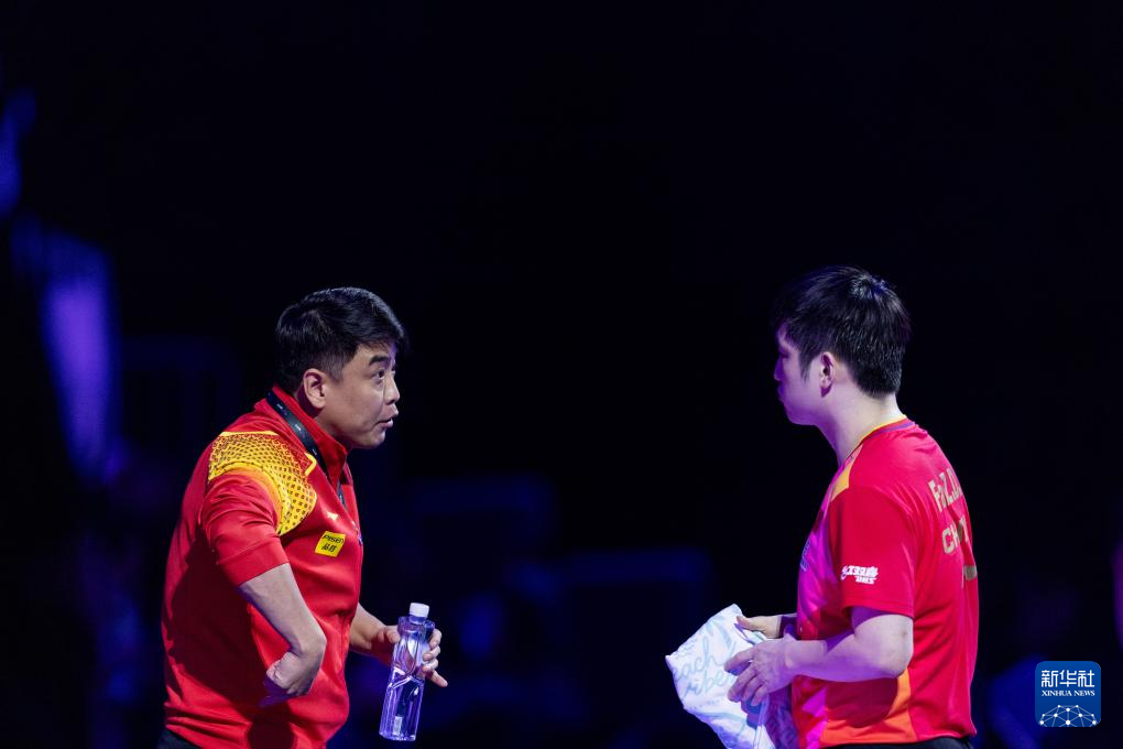 5月30日,樊振东(右)与教练王皓在比赛间隙交流。新华社记者 黄伟 摄