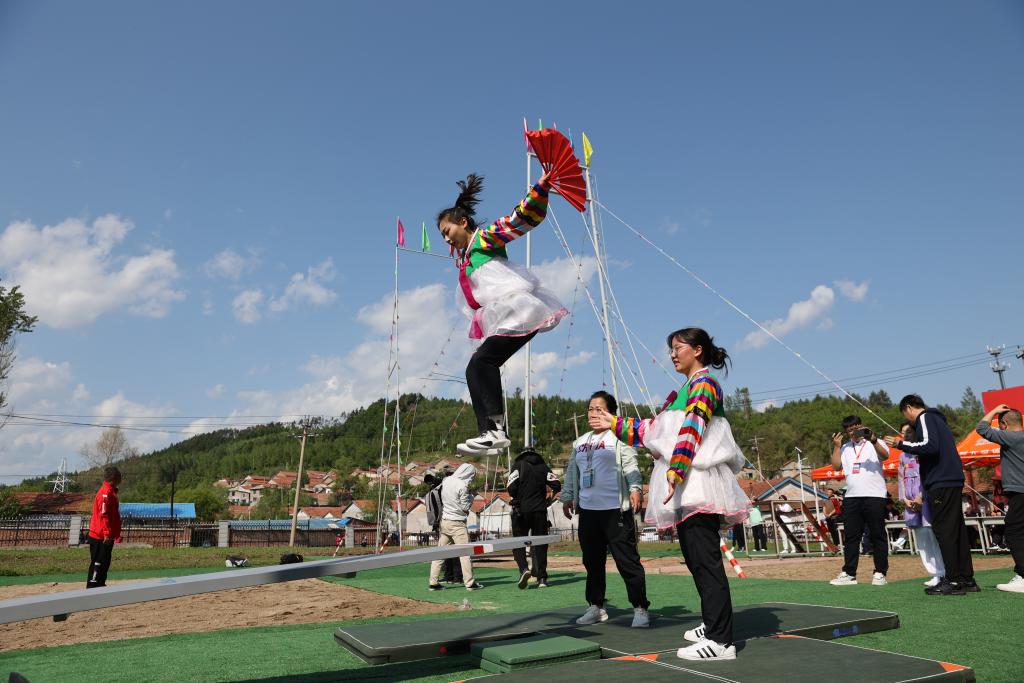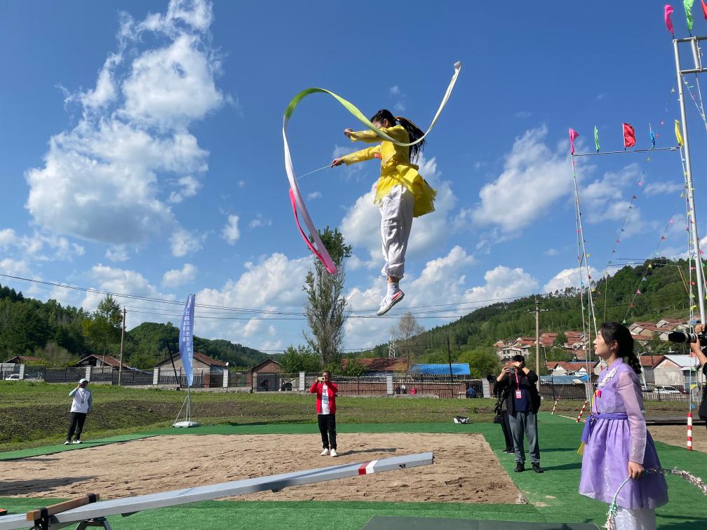 腾空、踢腿、落下……虽是瞬息之美,但跳板不仅是竞技运动,也是民族传统文化的展示。在自选动作环节,许多选手身着朝鲜族传统服饰,手持扇子、花环、手鼓、彩带等道具,借由跳板腾空而起,成为赛场上一道亮丽的风景线。
