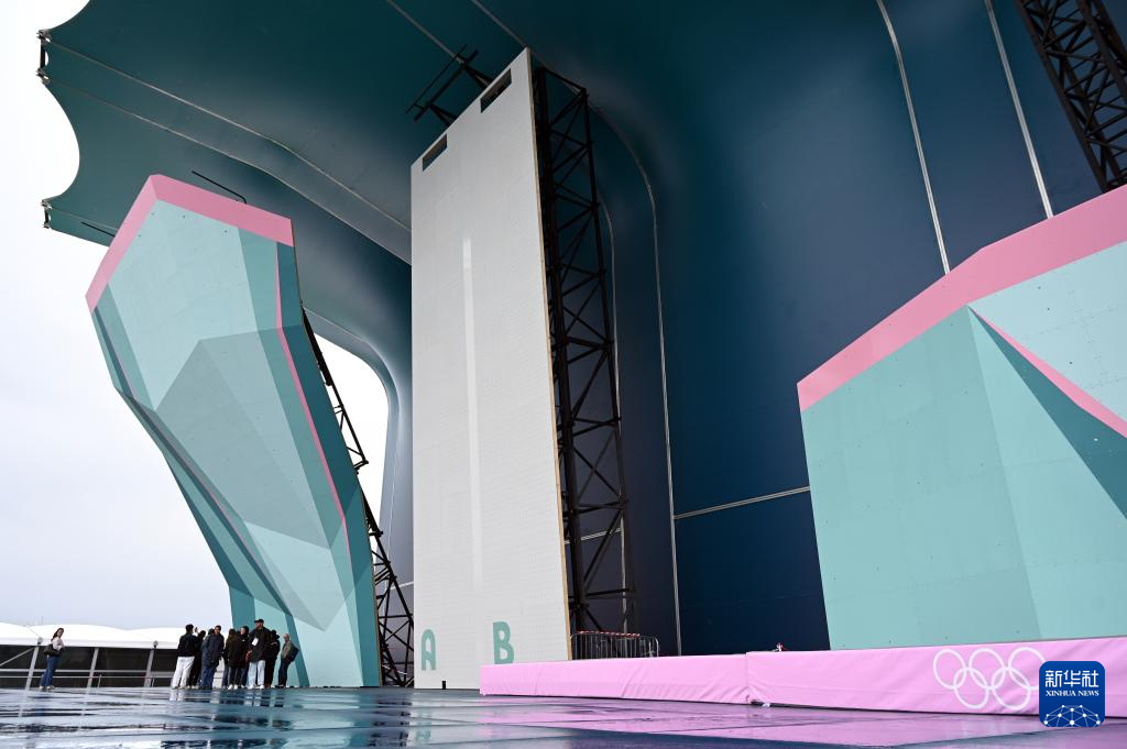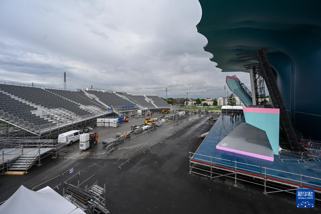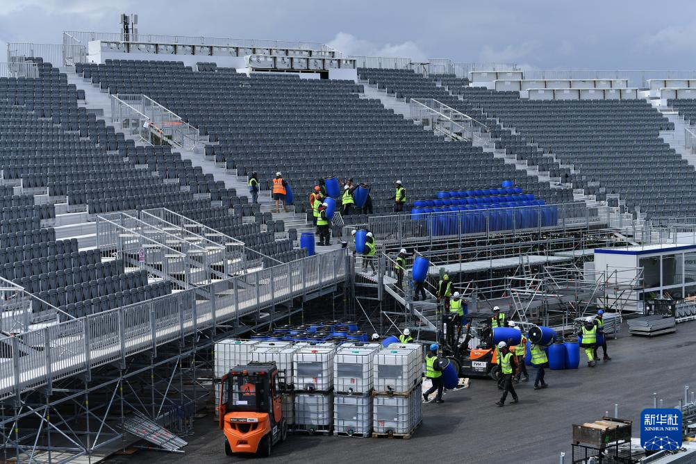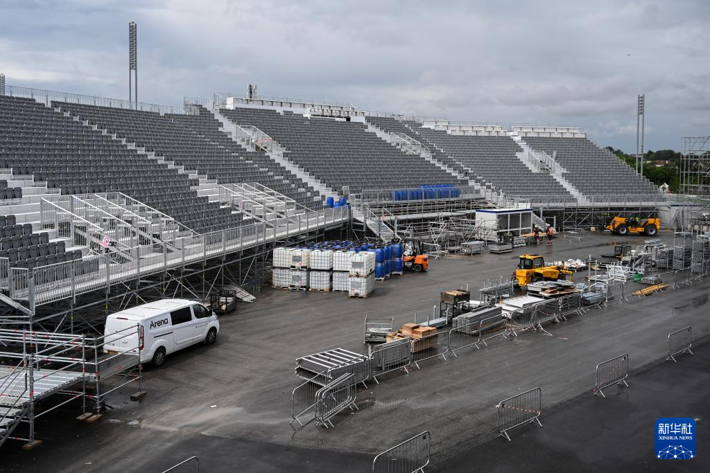 5月30日,工人在位于法国巴黎近郊的勒布尔歇运动攀岩馆搭建观众席。新华社发(朱利安·马蒂亚摄)