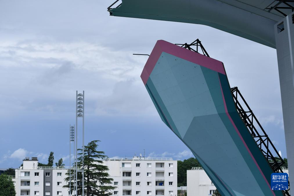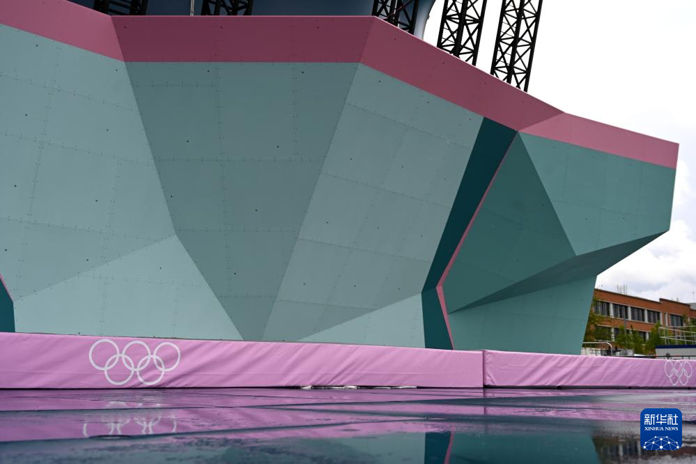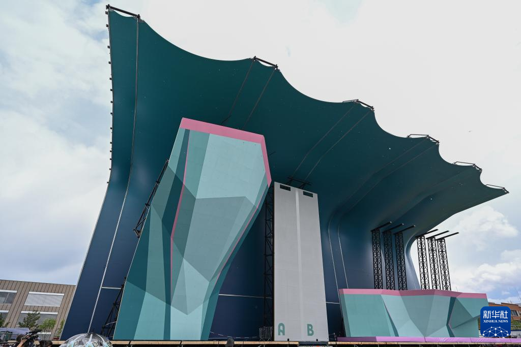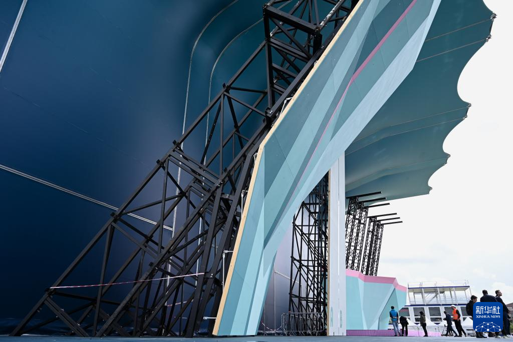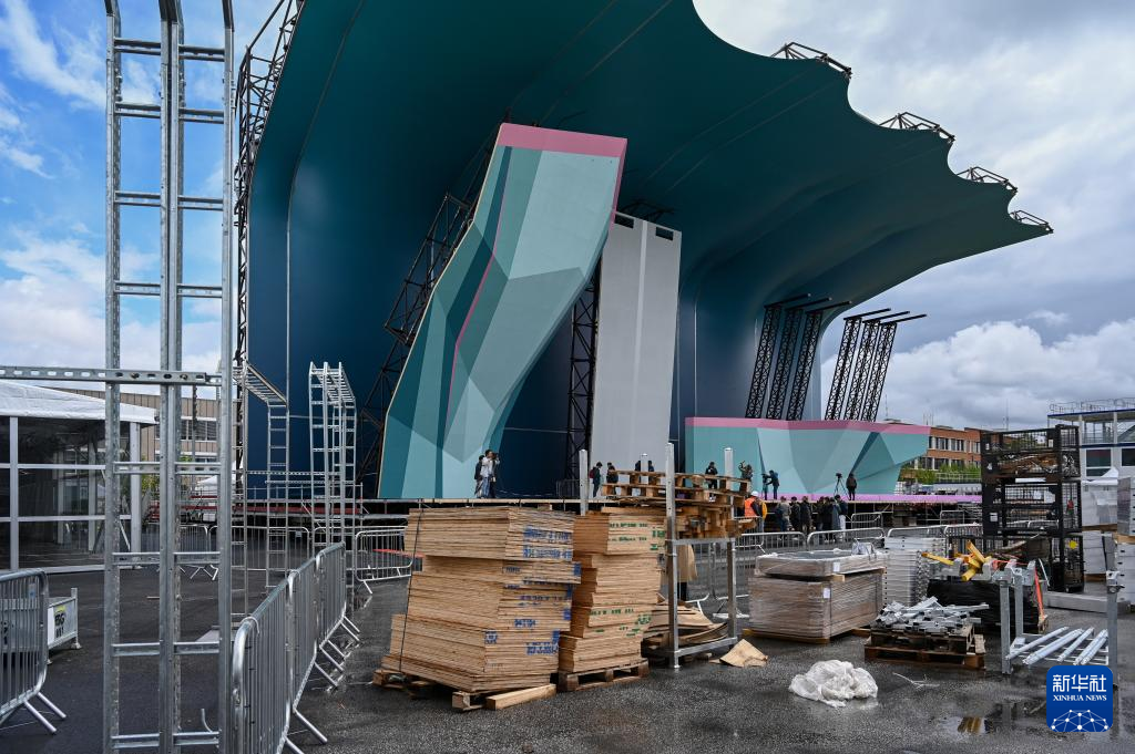 5月30日,工人在位于法国巴黎近郊的勒布尔歇运动攀岩馆搭建观众席。新华社发(朱利安·马蒂亚摄)