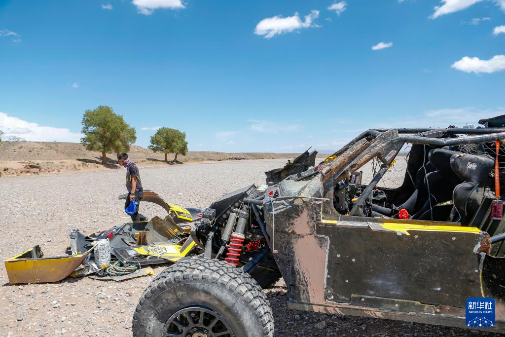 5月30日,韩魏汽车运车队中国车手李大治、领航员王先晨的赛车发生事故后,车队后援工作人员在捡拾遗落的零件。新华社记者 陈朔 摄