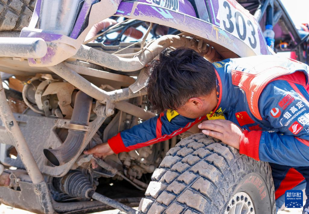 5月30日,黑熊轮胎SPEED-UTV车队中国车手王翔、领航员杨涛的车辆出现损坏,王翔对赛车进行检查。新华社记者 陈朔 摄
