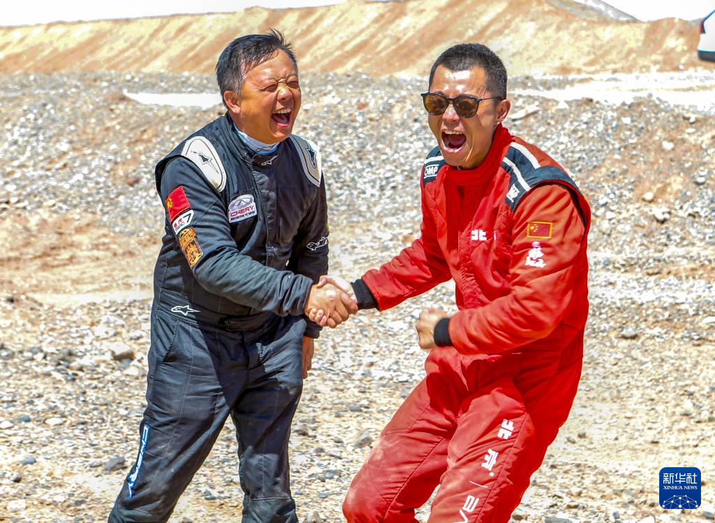 5月30日,北京汽车车队中国车手陈震(右)和奇瑞赛车队中国车手陶鹏飞在完赛后庆祝。新华社记者 陈朔 摄