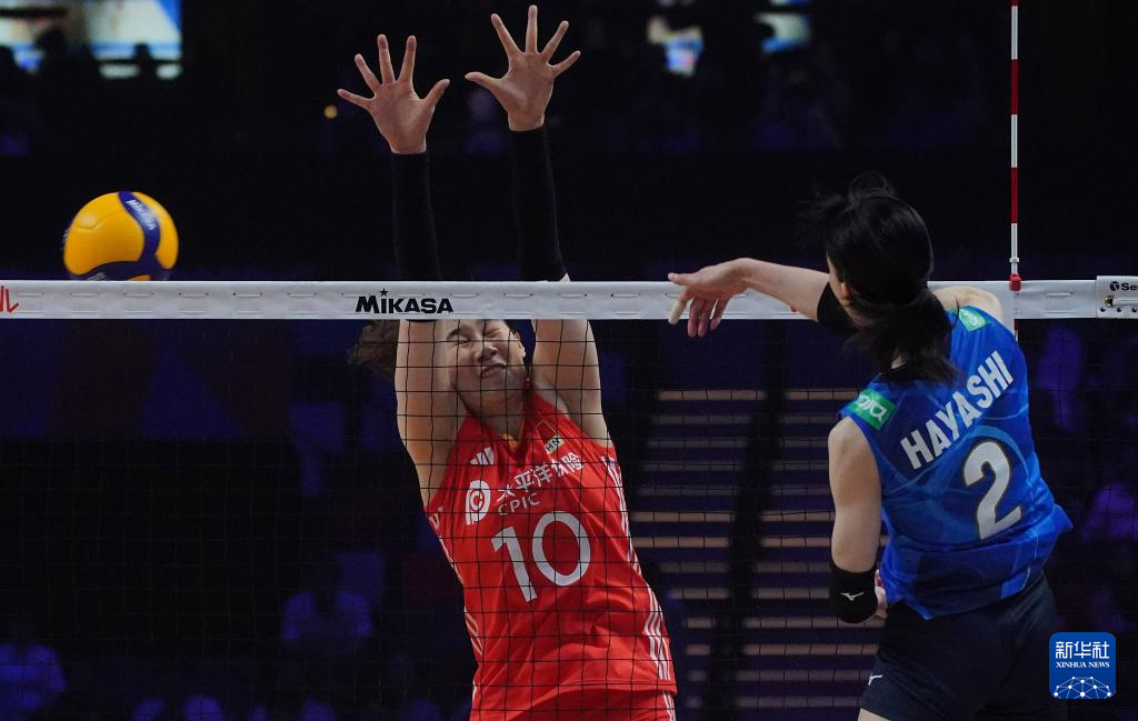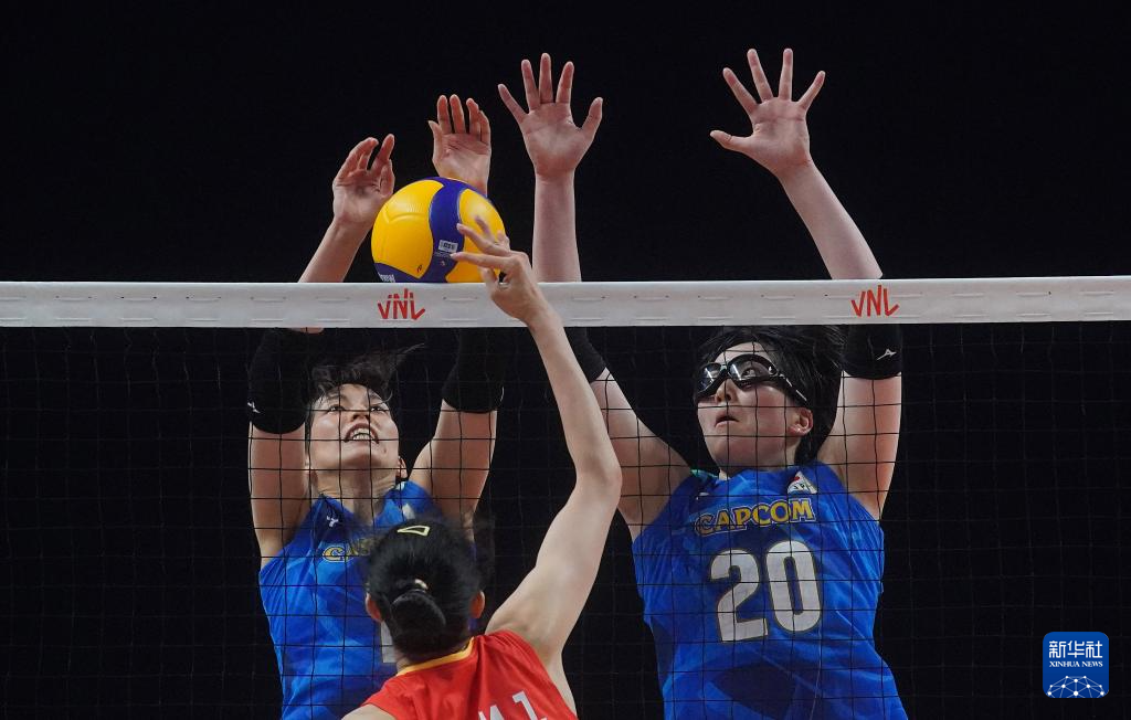 5月31日,日本队球员石川真佑(左)在比赛中拦网。