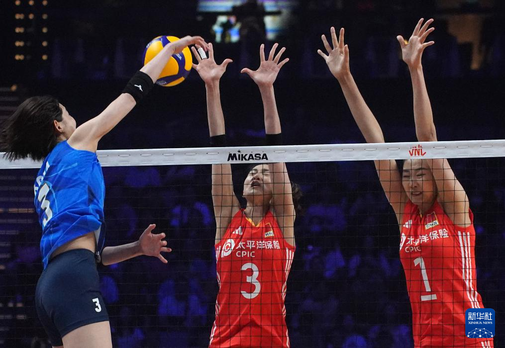 5月31日,中国队球员袁心玥(左)与王云蕗(中)在比赛中拦网。