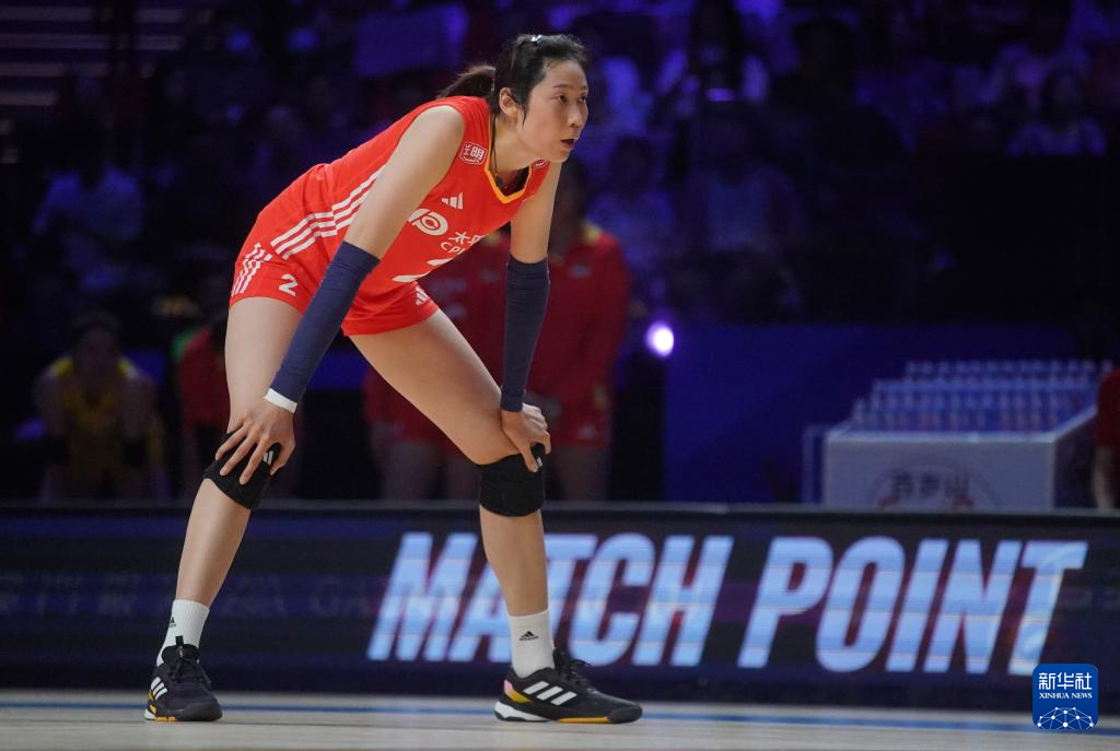 5月31日,中国队球员朱婷(右)在比赛中扣球。