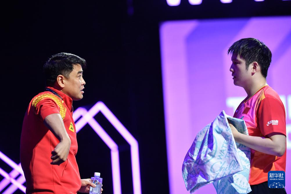 6月2日,樊振东(右)与教练王皓在比赛间隙交流。