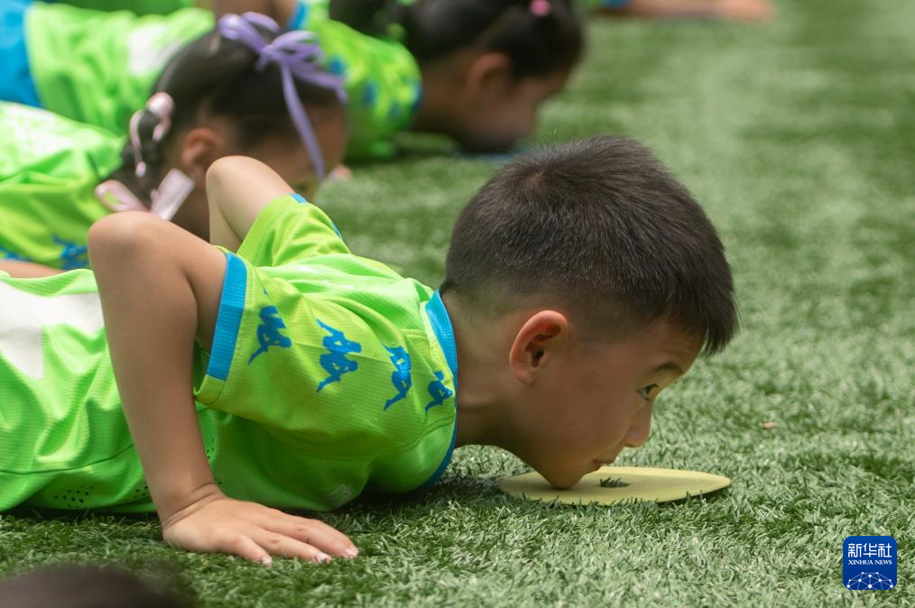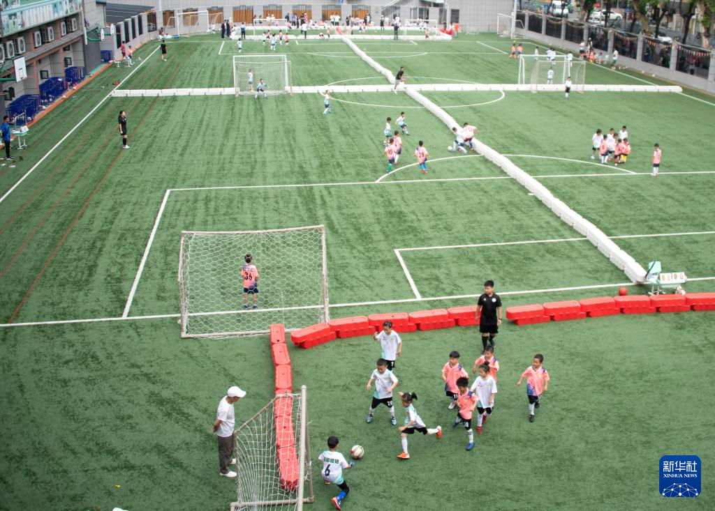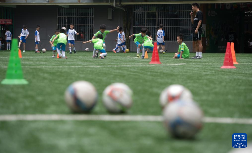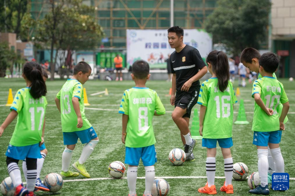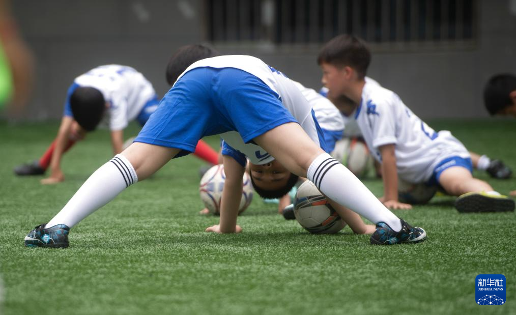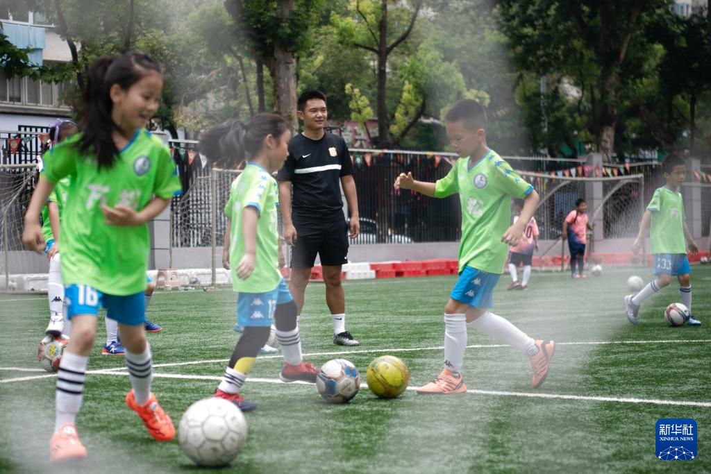 5月31日,在湖北省武汉市江汉区万松园路小学,孩子们在教练指导下进行足球训练。新华社记者 杜子璇 摄