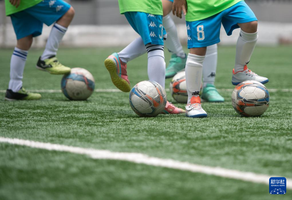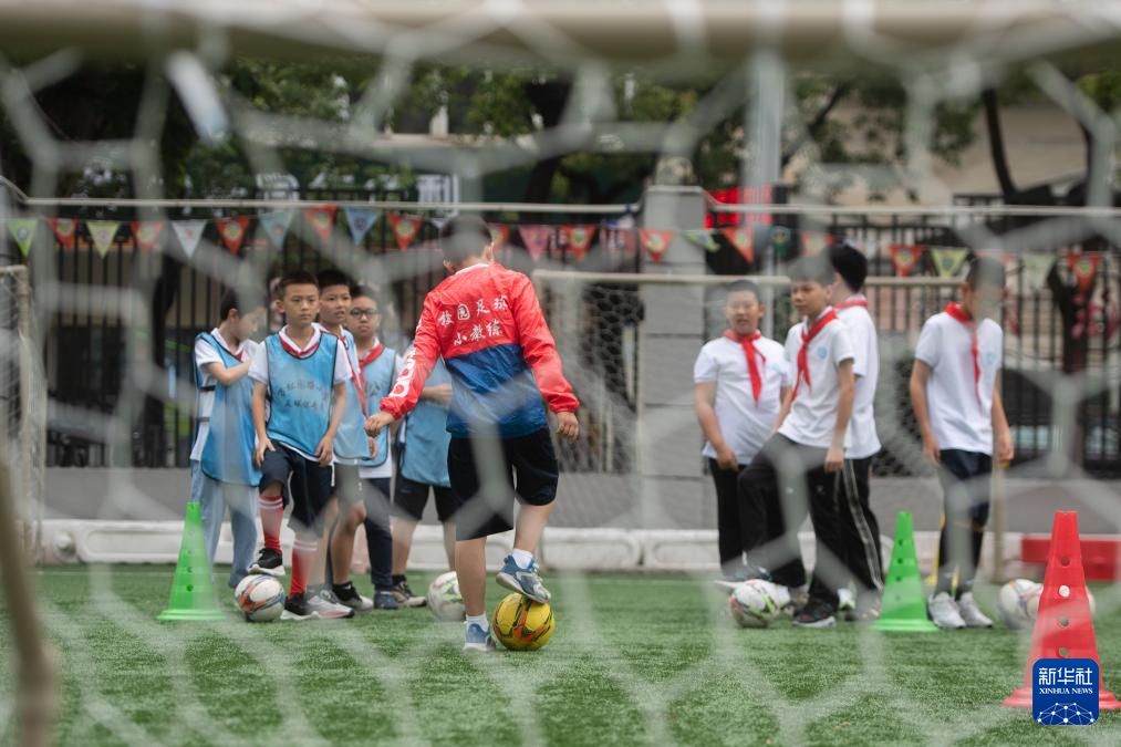 5月31日,在湖北省武汉市江汉区万松园路小学,孩子们进行足球训练。新华社记者 杜子璇 摄
