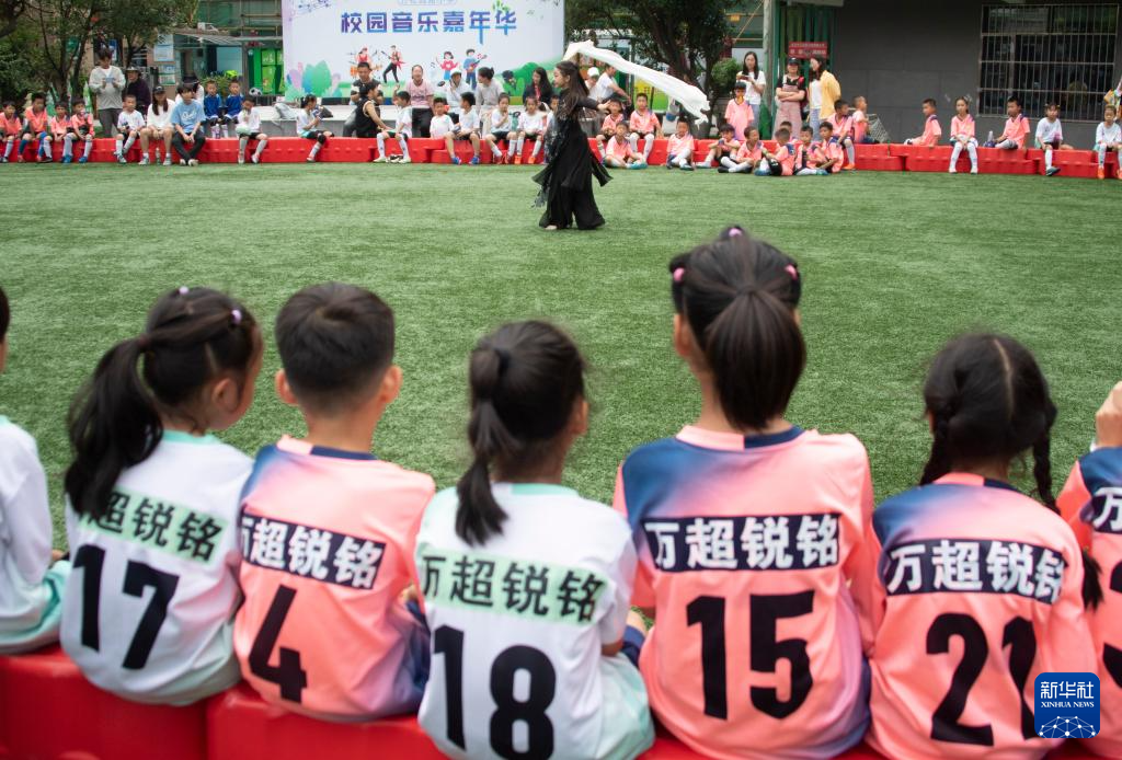 6月1日,在湖北省武汉市江汉区万松园路小学,孩子们在比赛间隙观看表演。新华社记者 杜子璇 摄