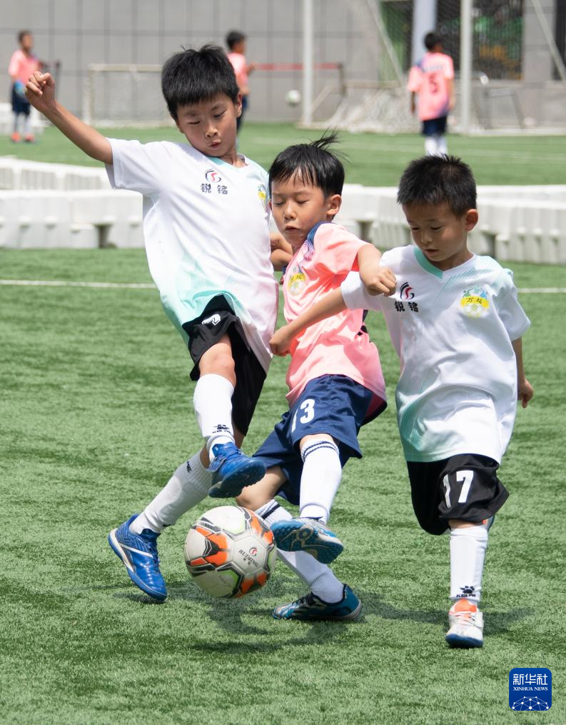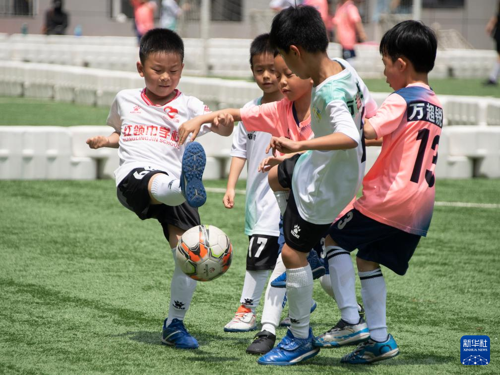 6月1日,在湖北省武汉市江汉区万松园路小学,孩子们在“万超”联赛中拼抢。新华社记者 杜子璇 摄