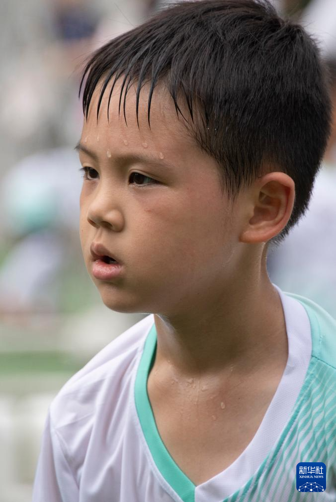 6月1日,在湖北省武汉市江汉区万松园路小学,一年级学生方奥欧在“万超”联赛中。新华社记者 杜子璇 摄