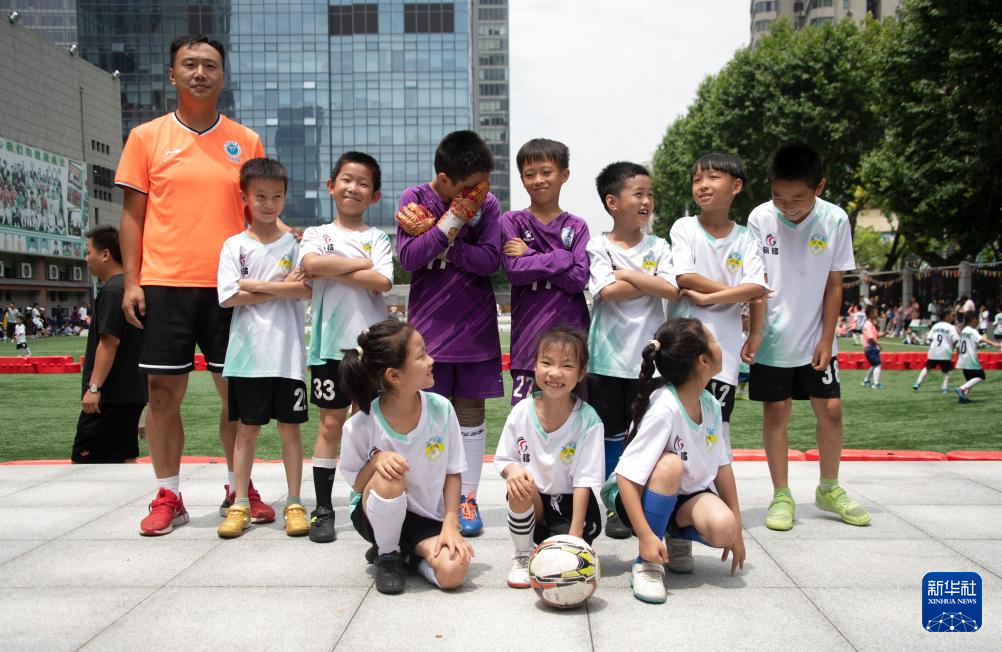6月1日,教练朱健虎(左一)和万松园路小学二年级的小球员们在湖北省武汉市江汉区万松园路小学“万超”联赛现场合影。新华社记者 杜子璇 摄