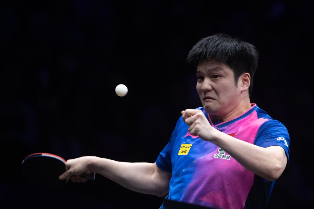 6月2日,樊振东在比赛中回球。新华社记者 唐奕 摄