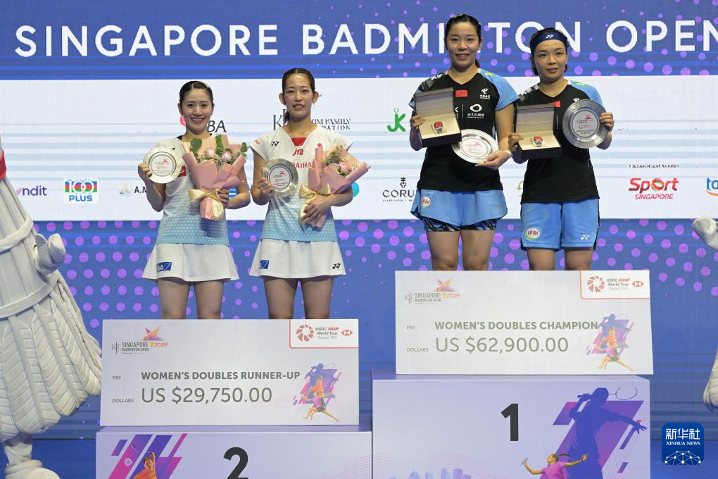 6月2日,冠军陈清晨(右一)/贾一凡(右二)、亚军松山奈未(左二)/志田千阳在颁奖仪式上。新华社发(邓智炜摄)