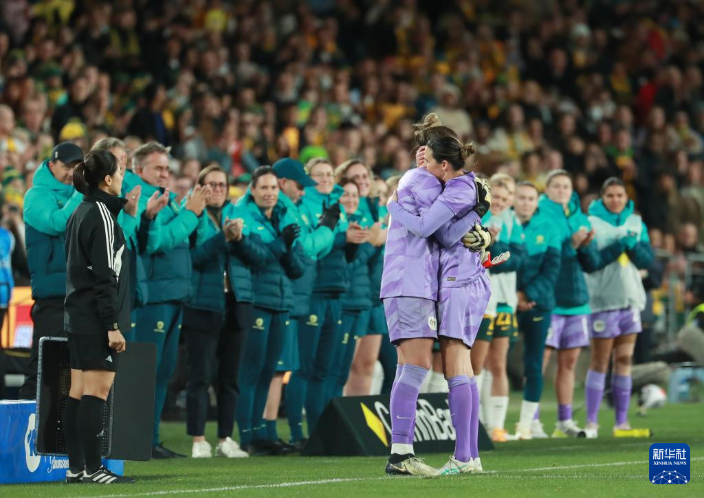 6月3日,澳大利亚队守门员威廉姆斯(前右)被换下场后与替补守门员阿诺德拥抱。新华社记者 马平 摄