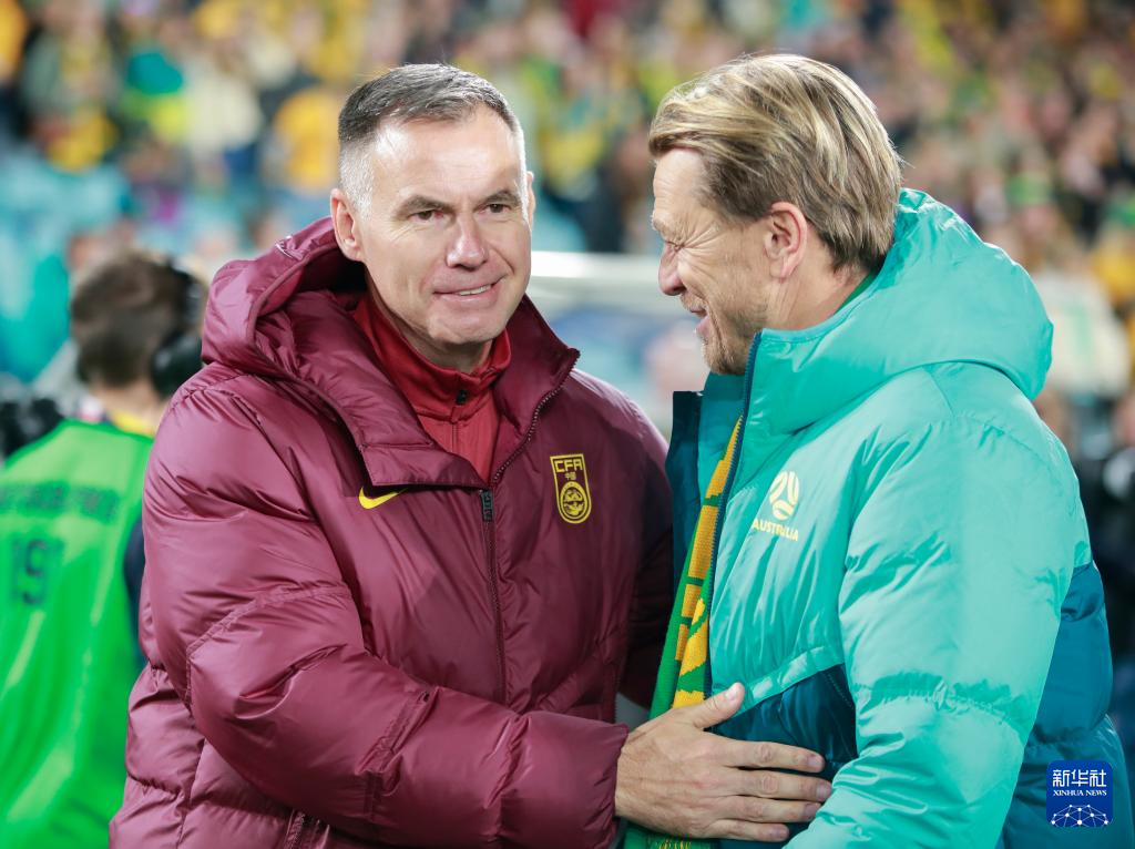 6月3日,中国女足主教练安特·米利西奇(左)与澳大利亚女足主教练托尼·古斯塔夫森在比赛前。新华社记者 马平 摄
