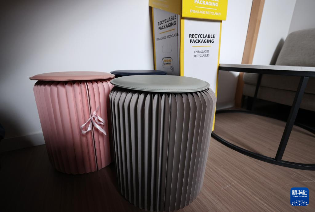 这是6月4日在巴黎奥运村和残奥村运动员公寓内拍摄的可折叠座椅。新华社记者 高静 摄