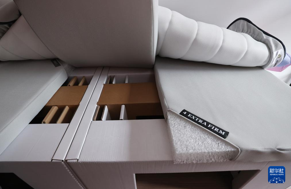 这是6月4日在巴黎奥运村和残奥村内拍摄的可回收床架和床垫。新华社记者 高静 摄
