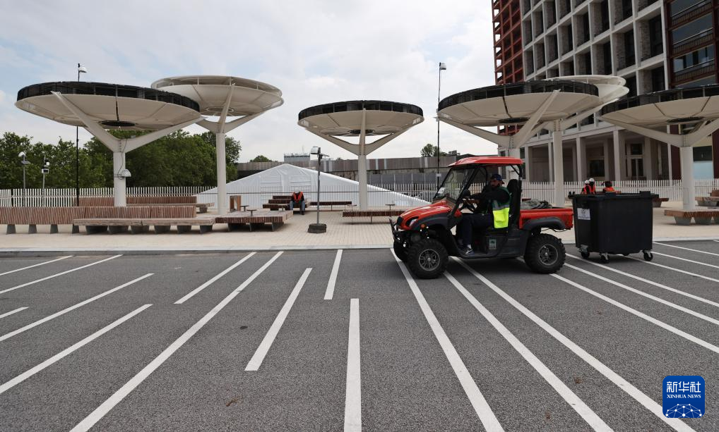 6月4日,在巴黎奥运村和残奥村,工作人员经过一处用于净化空气的装置。新华社记者 高静 摄