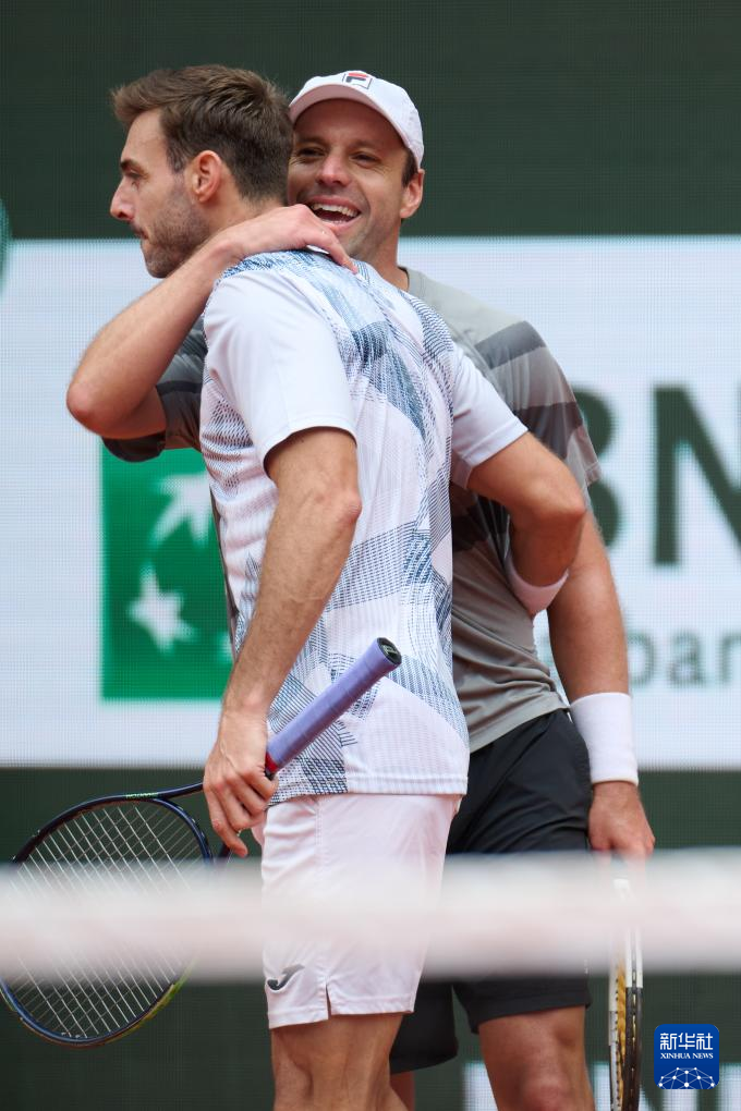 6月5日,格拉诺列尔斯/塞瓦略斯(后)在比赛后庆祝胜利。新华社记者 孟鼎博 摄