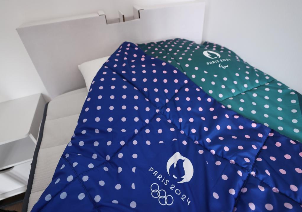 这是6月4日在巴黎奥运村和残奥村内拍摄的带有巴黎奥运会标识的床上用品。新华社记者 高静 摄