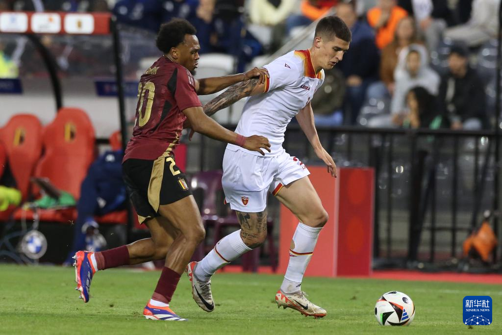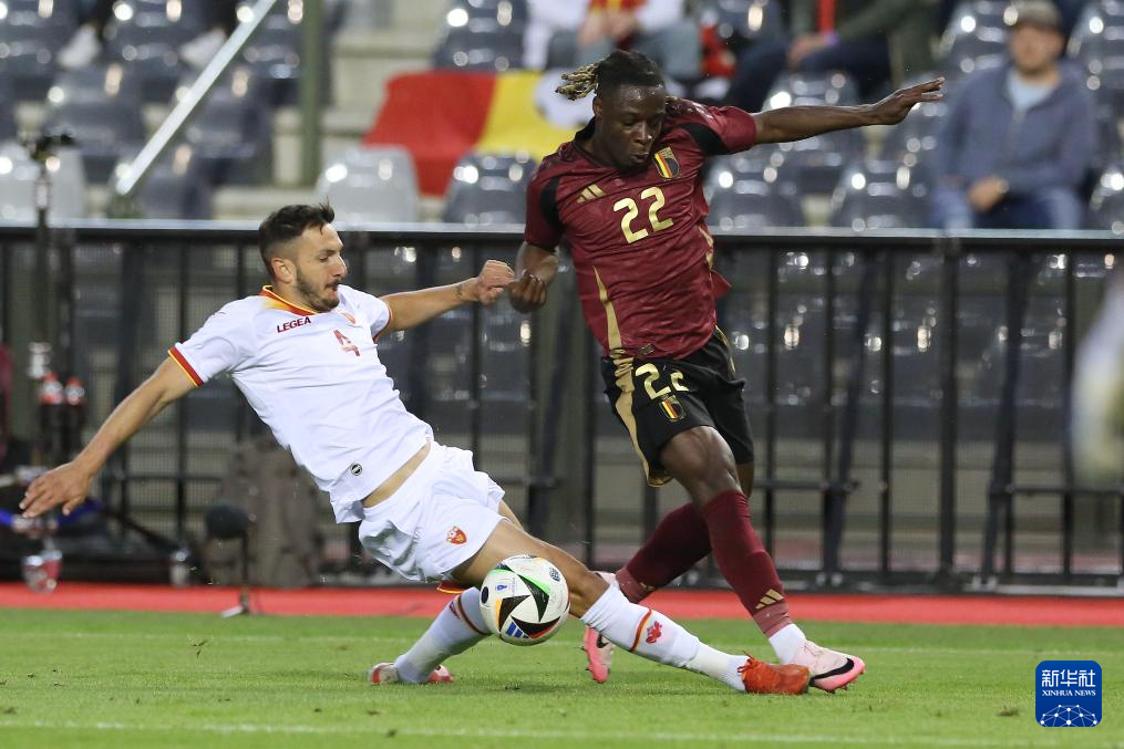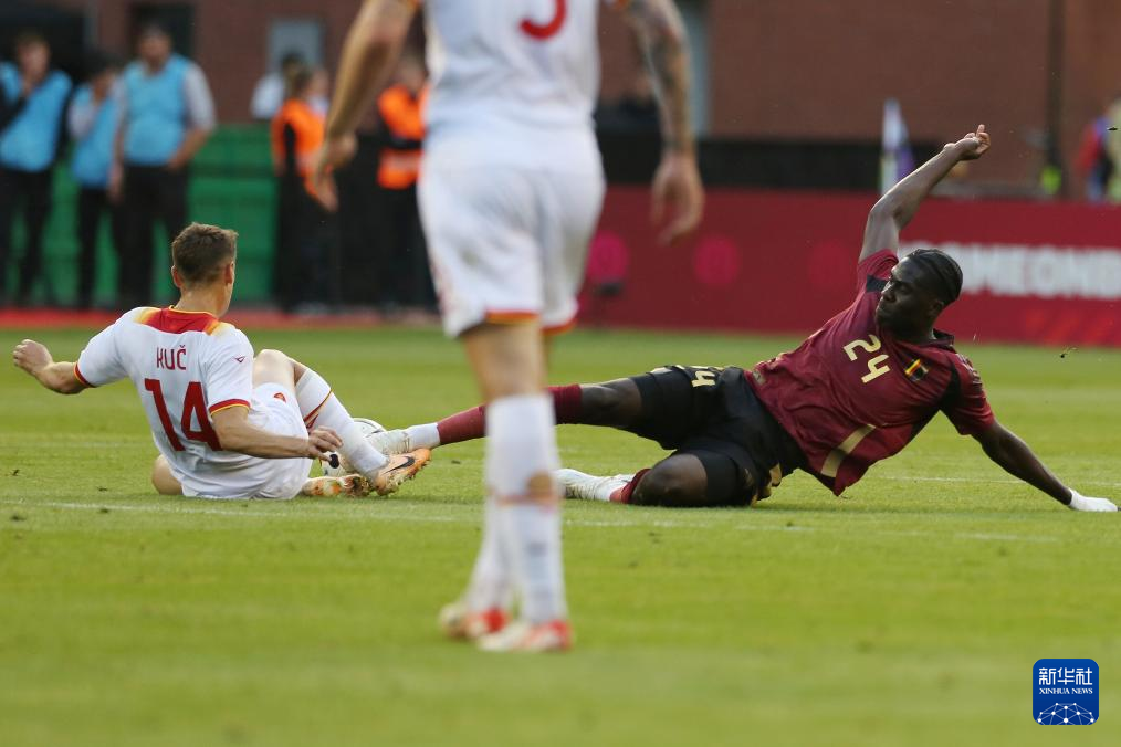 6月5日,比利时队球员奥蓬达(左)和黑山队球员鲁贝日奇在比赛中拼抢。新华社记者 赵丁喆 摄