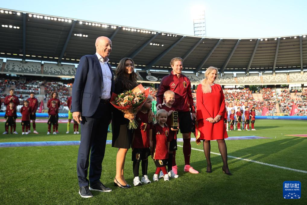 6月5日,比利时队球员德布劳内(右二)与家人在赛前合影留念,纪念为比利时队第100次出场比赛。新华社记者 赵丁喆 摄
