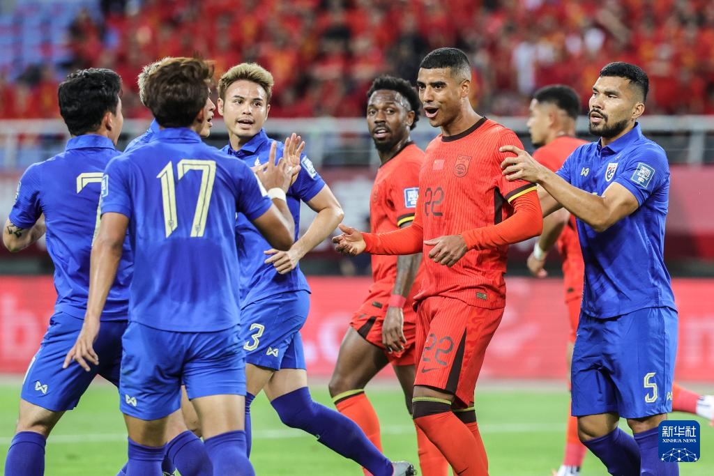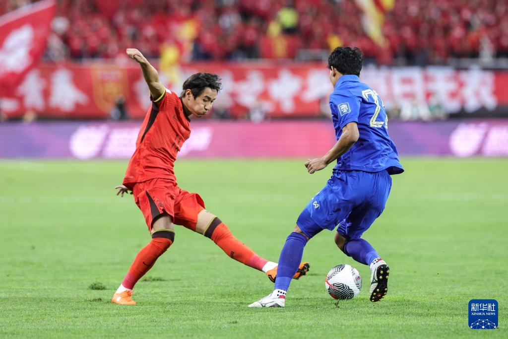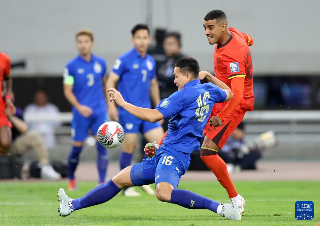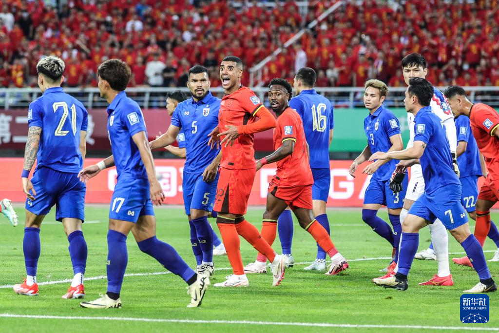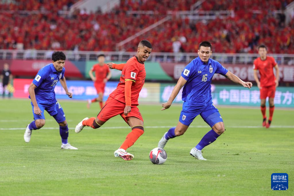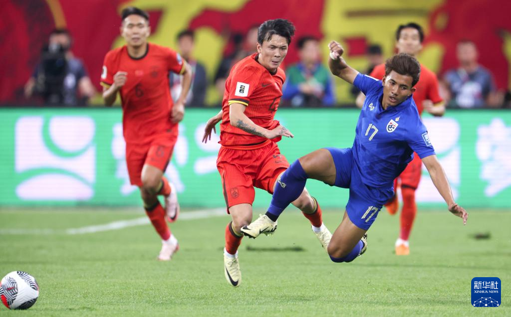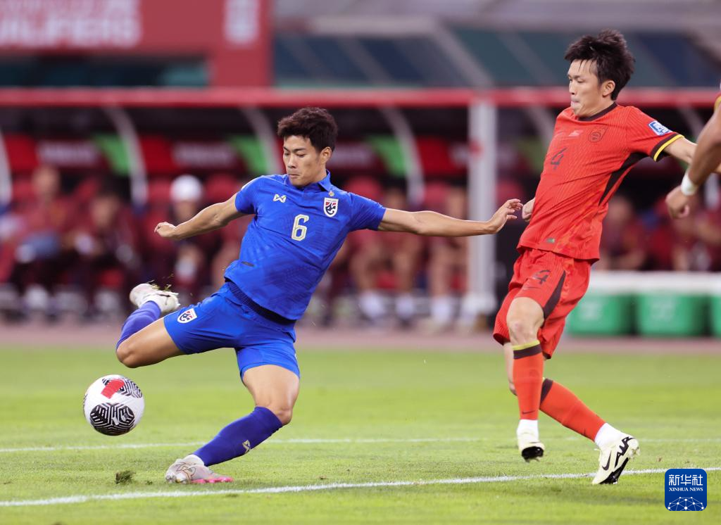 6月6日,首次代表国家队出场的中国队球员王振澳(前左)在比赛中与泰国队球员素帕那拼抢。新华社记者 曹灿 摄