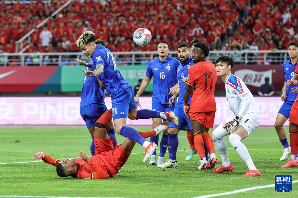 6月6日,中国队球员费南多(右二)在比赛中与泰国队球员素攀(左二)、提拉通(右一)拼抢。新华社记者 潘昱龙 摄