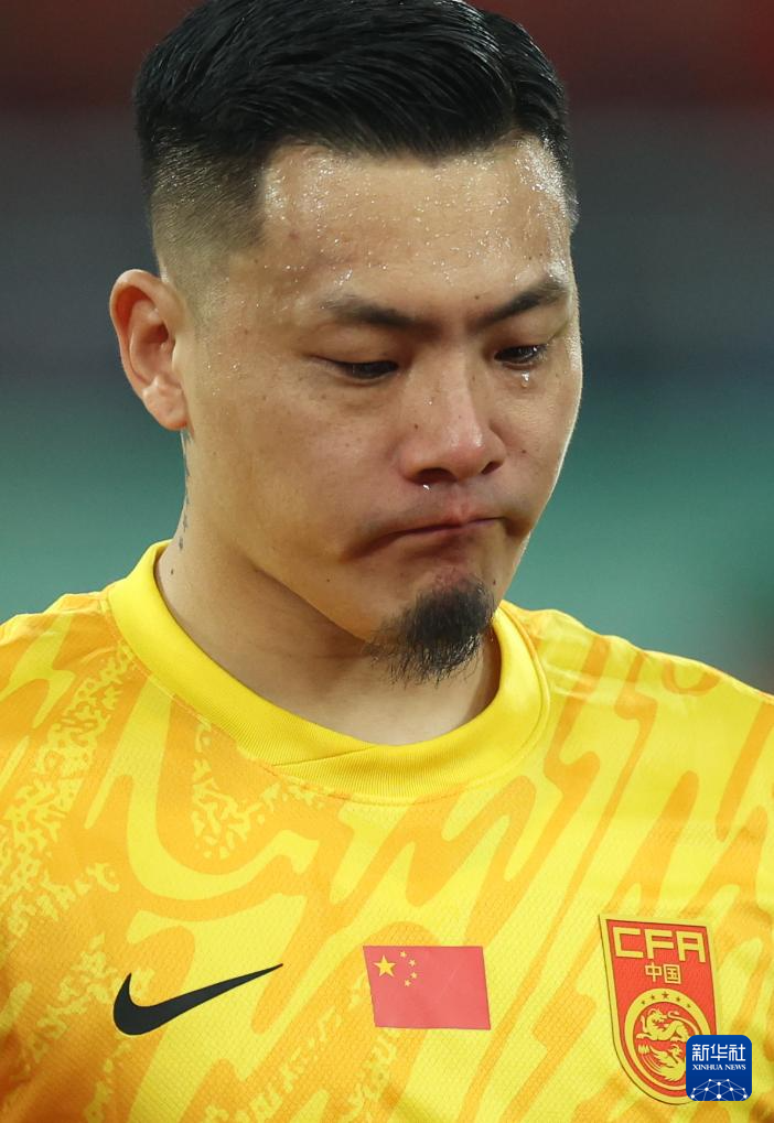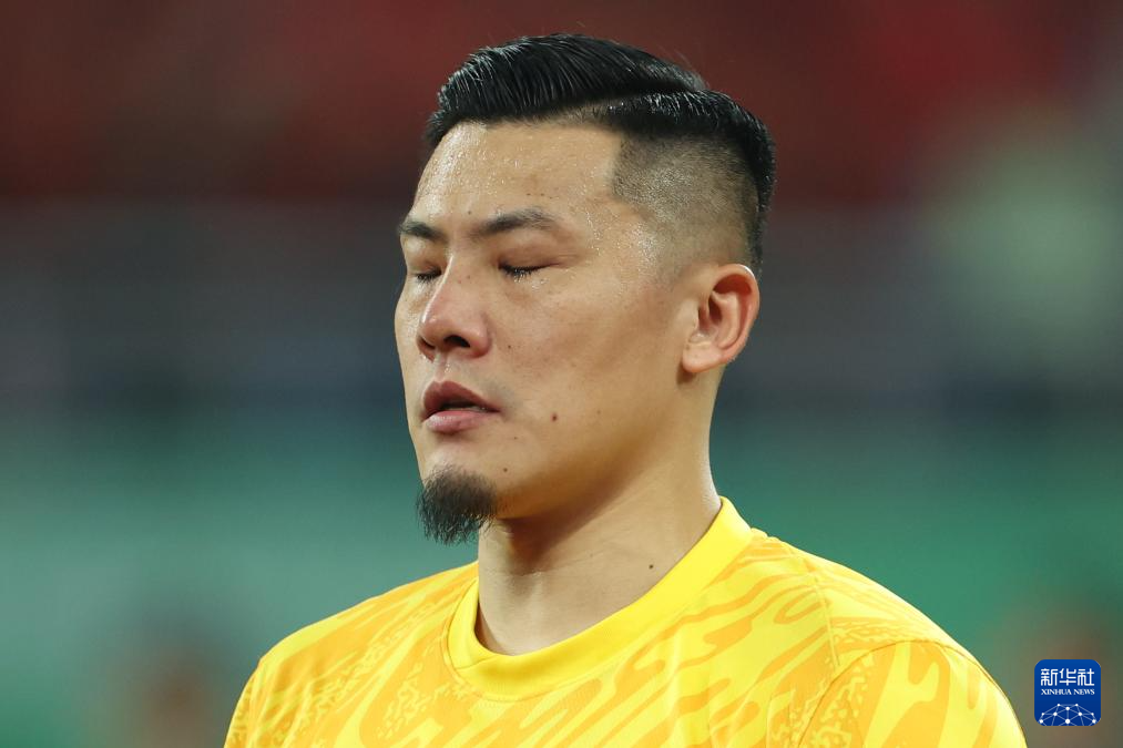 6月6日,中国队守门员王大雷在赛前奏唱国歌仪式上。新华社记者 曹灿 摄